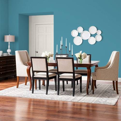 Un jaune lumineux convient bien aux murs principaux d’une cuisine. Accompagnez-le d’appareils en acier inoxydable et un sous-plafond anthracite foncé comme accents.