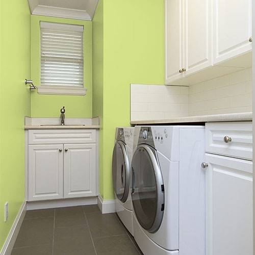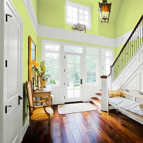 Réveillez la salle à dîner avec ce jaune pâle. Appliquez cette couleur sur la partie inférieure du mur et assortissez-la de moulures blanches.