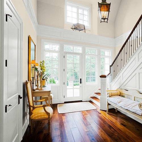 Dans une chambre de bébé transitionnelle, ajoutez ce joli jaune sur un mur accent. Ajoutez un mur anthracite et des boiseries blanches pour compléter le look.
