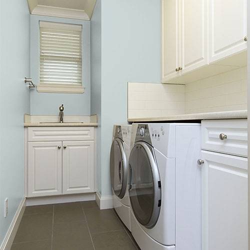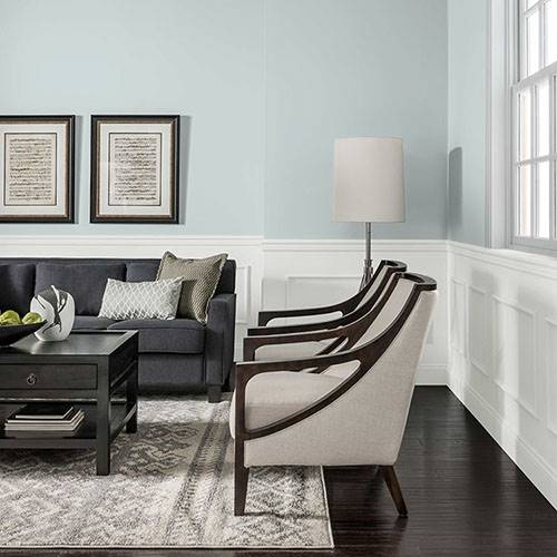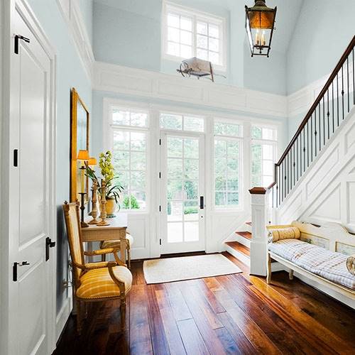 Pour préparer une entrée majestueuse, appliquez-y ce jaune élégant. Utilisez des blancs frappants comme contrastes sur les moulures architecturales.