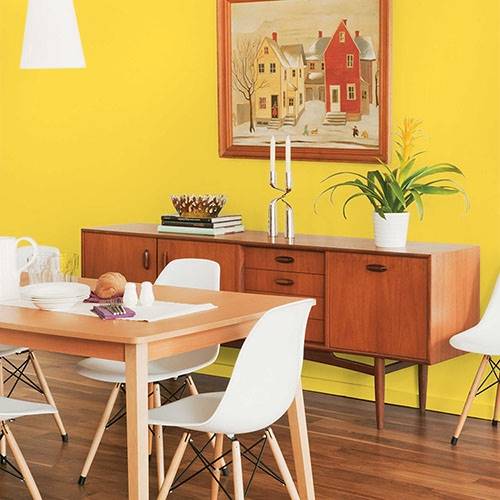 Ce jaune pastel frais conviendra à n’importe quel espace. Utilisez des boiseries blanches et des touches contrastantes de vert pour un look inspiré de la nature.
