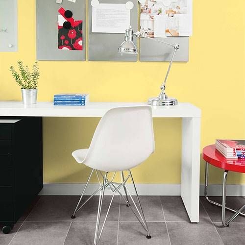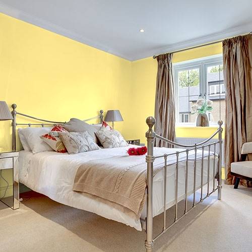 Ce jaune intense convient vraiment bien à un mur accent. Accompagnez-le de jaunes plus pâles et de touches de violet pour compléter le look.