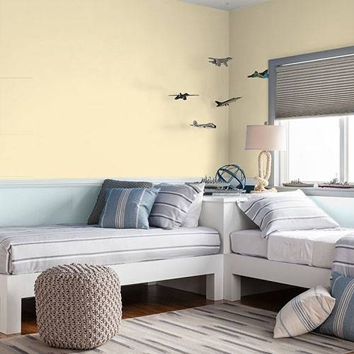 Un jaune lumineux convient bien aux murs principaux d’une cuisine. Accompagnez-le d’appareils en acier inoxydable et un sous-plafond anthracite foncé comme accents.