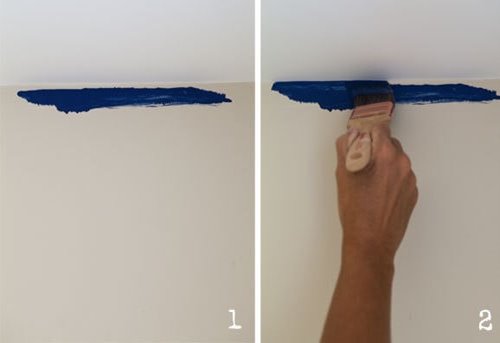 Este método requiere algo de práctica, pero con la brocha correcta y buen pulso, puede pintar una línea perfecta donde la pared se une con el techo.- Con una brocha angular de buena calidad, aplique pintura en la pared a 1/4" debajo del techo. Me gusta usar una brocha angular de 2".