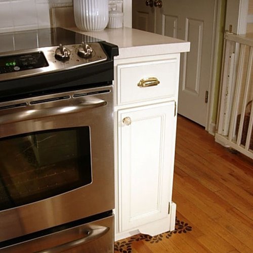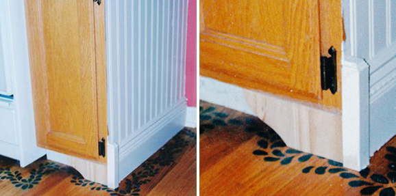 Agregué paneles de poliestireno expandido, zócalos decorativos y remates para esquinas a los laterales de los gabinetes y corté un soporte de estante de madera para poner debajo del gabinete para que luzcan más personalizados.