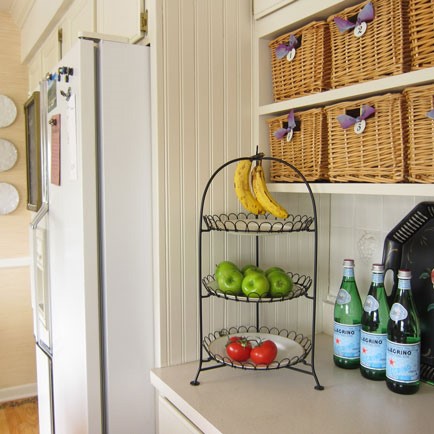 Retiré el empapelado antiguo y lo reemplacé con tela de ramio en color arena. Encontré las cestas con descuento en la tienda de muebles para el hogar local. Entraron perfectamente en los estantes empotrados.