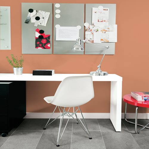 ¿Su sala de estar necesita un color de pintura que ilumine las paredes y haga sentir cómodos a los invitados? Un color anaranjado tenue como Cinnamon Brandy lo ayudará con eso. Este color de pintura coral claro le ofrece un tono cálido en el que querrá envolverse. Creará una sensación acogedora en su sala de estar y al mismo tiempo se destacará. Se puede combinar bien con tonos neutros, pero también hace juego con detalles más oscuros. Los muebles de cuero se ven geniales en una habitación con paredes color Cinnamon Brandy.Ver más colores de pintura anaranjados