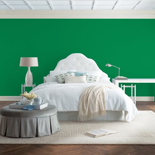 Si está buscando ideas singulares para dormitorios pequeños, no encontrará nada más llamativo que un verde intenso y vibrante como Blarney Stone. Este color combina bien con detalles en tonos tierra, como mesas y cómodas de madera. Es atrevido e intenso, y cuando entra en la habitación es lo primero que nota. A veces, uno no quiere ser sutil, sino que busca un color de pintura verde que sea tan audaz como uno. Este verde brillante tiene un toque terroso, pero en general transmite un aire luminoso y alegre.Color de pintura See Blarney Stone