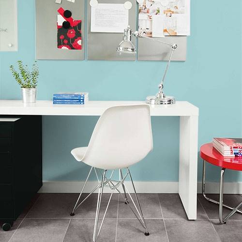 This midtoned teal is an elegant restful hue, perfect for a bedroom. Pair white trim and white washed wood accents in décor.