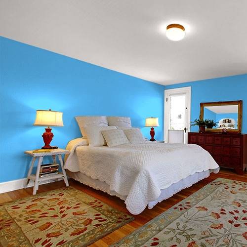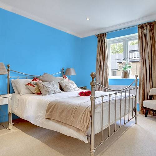 This strong azure blue is quite a lovely accent wall. A Grecian appearance in style, pair with white trim and black accents.
