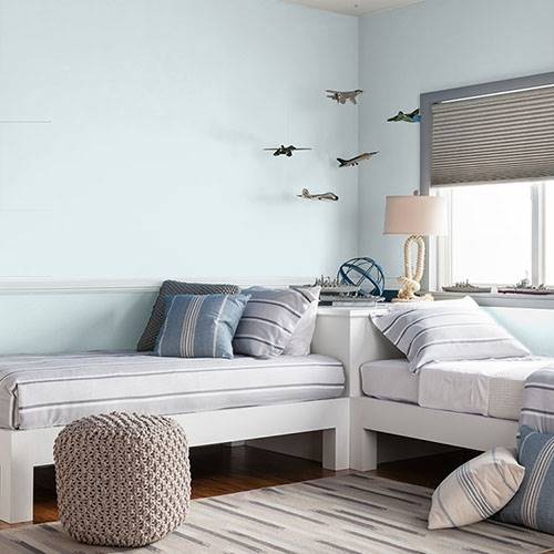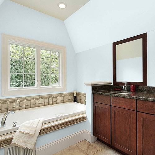 A frosty blue is an exquisite color for a bathroom. Keep it light and airy by using a white trim in this area.