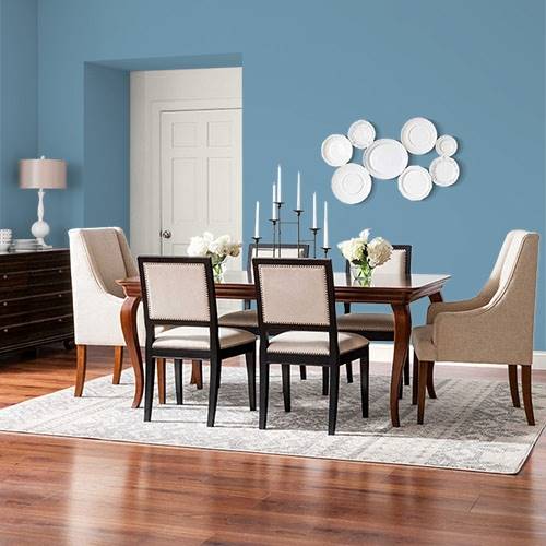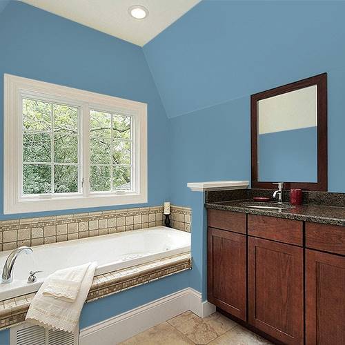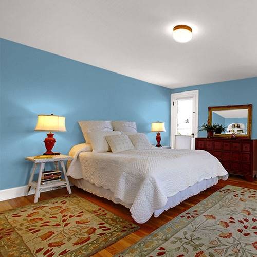 This is a lovely midtoned blue that creates a beautiful bedroom. Trim this serious blue in white trim. Apply lighter shades of blue in accessories.