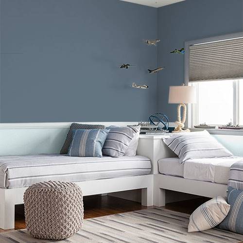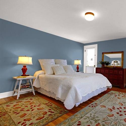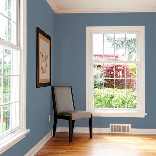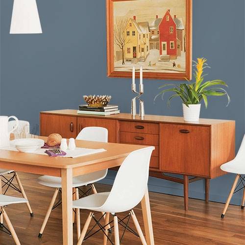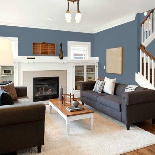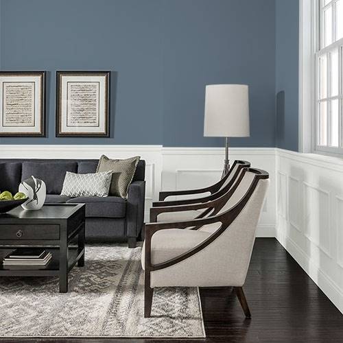 For a stunning accent wall use this breathtaking slate blue in a living room. Warm gold décor creates a pop of sizzle in this space.