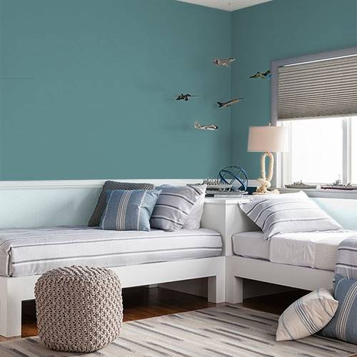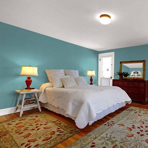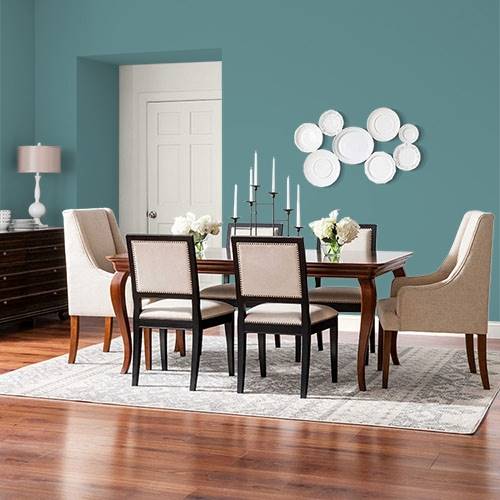 This ocean teal creates a tropical dining experience. Surround remaining walls with lighter aqua tones for contrast.
