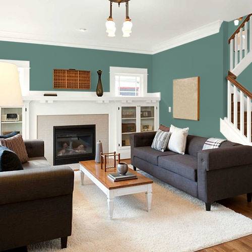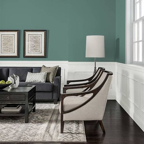 This hazy deep green creates an inviting dining room. Contrast with deep mahogany woods and off white trim.