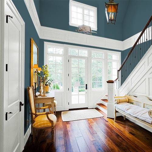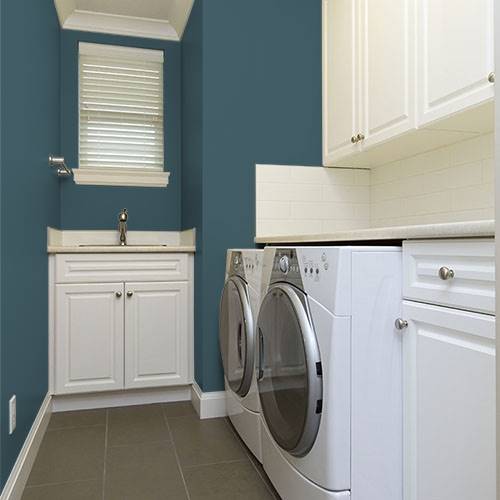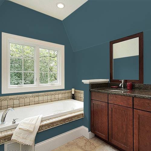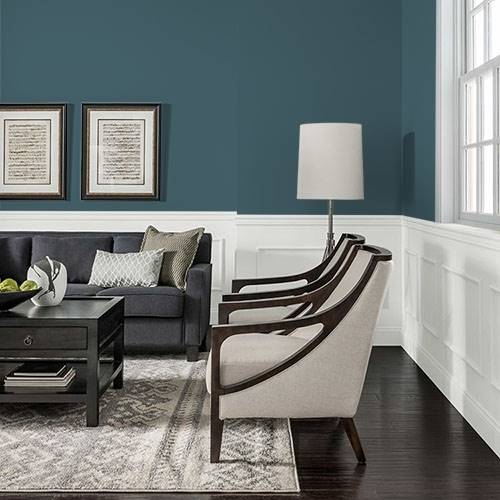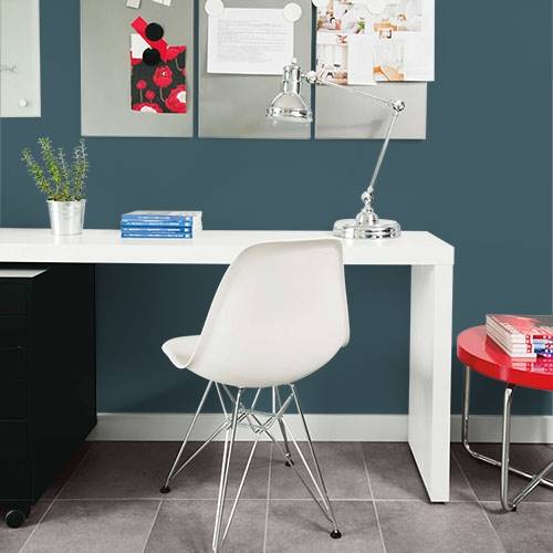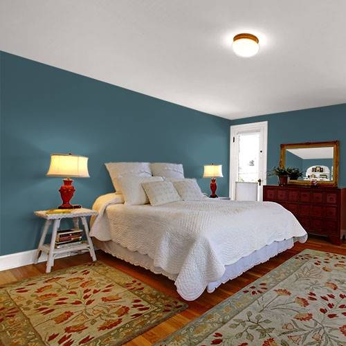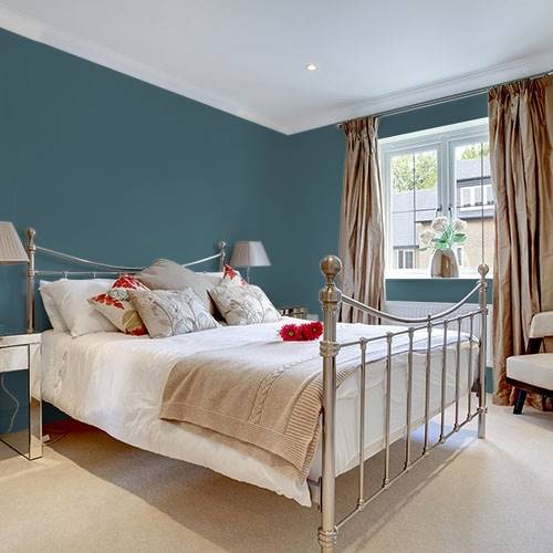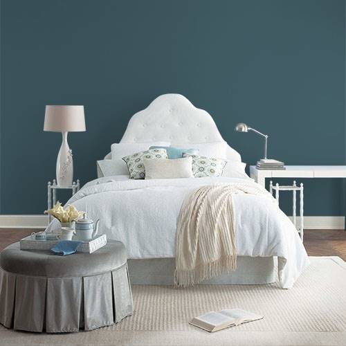 A moody teal creates a beautiful accent wall in a bedroom. Add Parisian style prints on the wall for a fashionable statement.