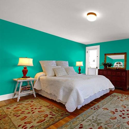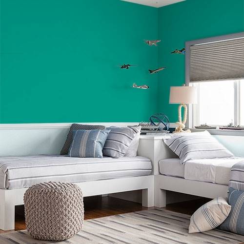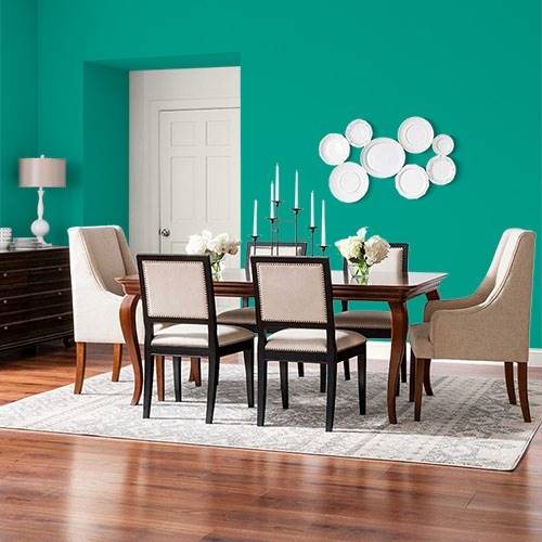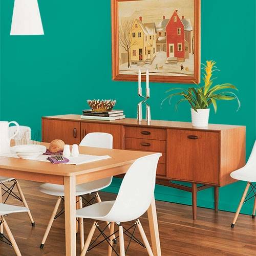 A saturated brilliant green is perfect for an accent wall. Pair with off white trim and black accents to balance this strong color.