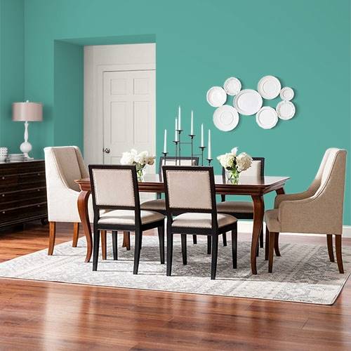 For a dramatic dining room, use this exciting midtoned green. Add luxurious golds for a harmonious setting.