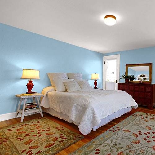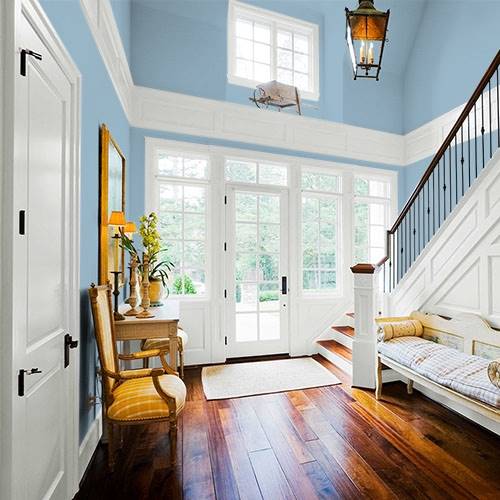 A soft midtoned blue is romanced in a kitchen area. Contrast with white subway tile in the backsplash areas as well as white cabinetry.