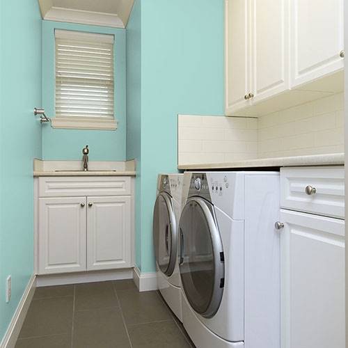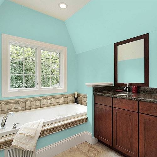 This lighter blue green can be applied to a dining room. Add fresh pastels of corals to liven the surrounding walls.