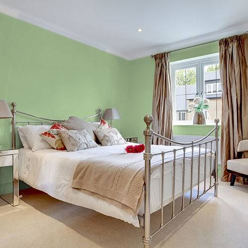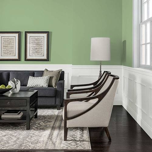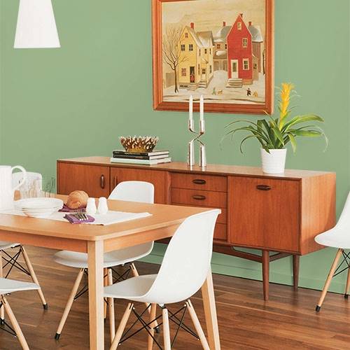 This balanced midtoned green creates a chic kitchen. Contrasts of stainless steel appliance and black accents complete this style.