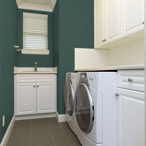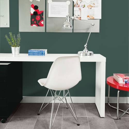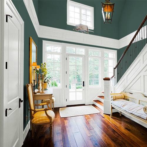 A lovely refined green can be applied on an accent wall in a living room. Surrounding walls can be Carmel and tans to coordinate with this rich hue.