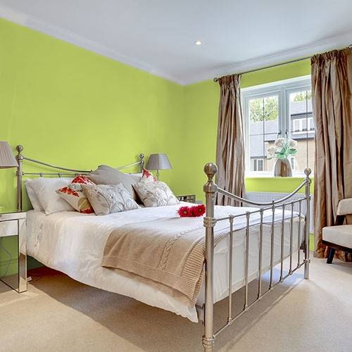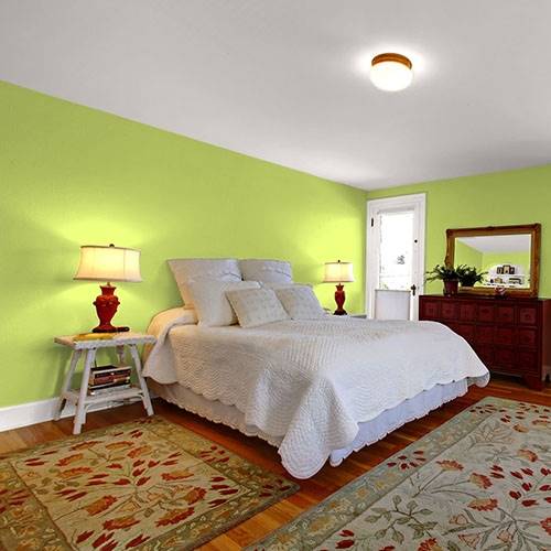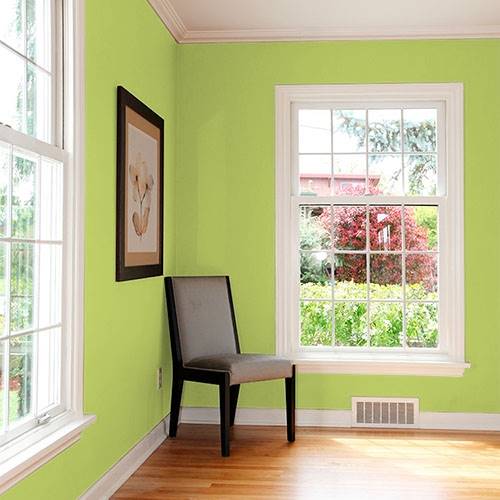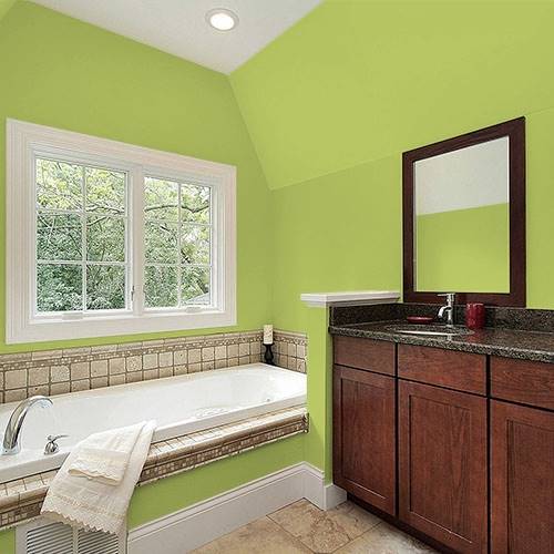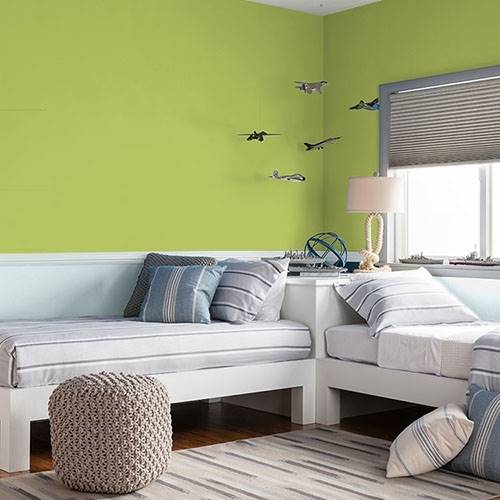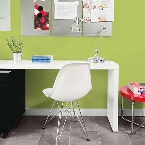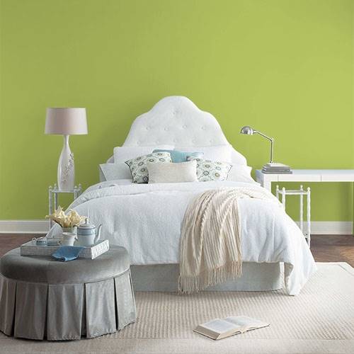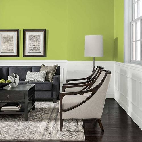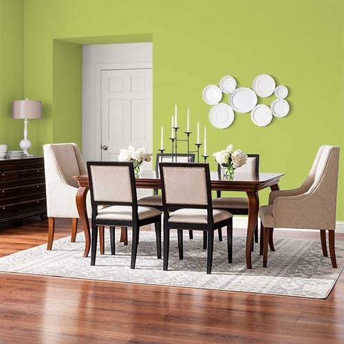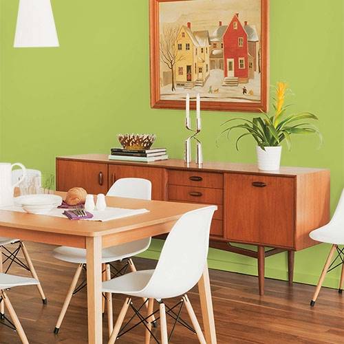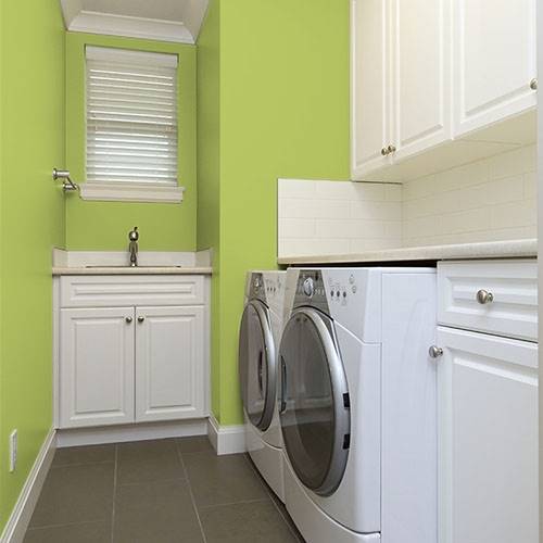 For a lively and effervescent kitchen add this punchy green to an accent wall or soffit area. Coordinate white cabinetry with fun subway tile.