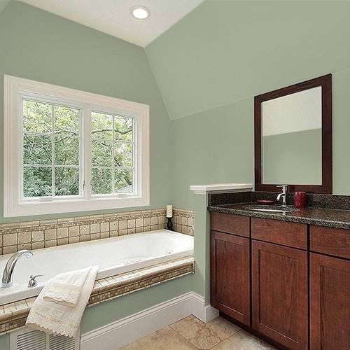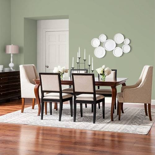 A subtle sage green brings natural surroundings to the dining area. Deep cherry wood furniture creates elegant accents to this space.