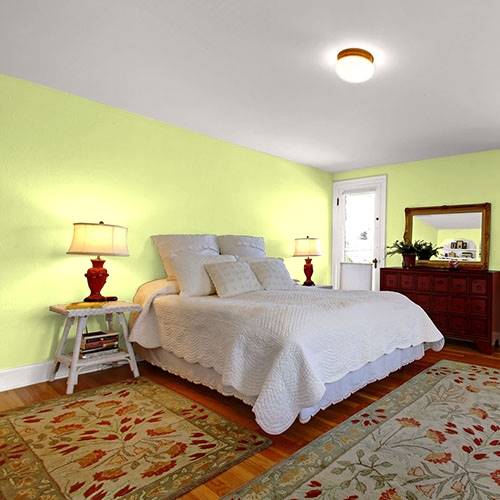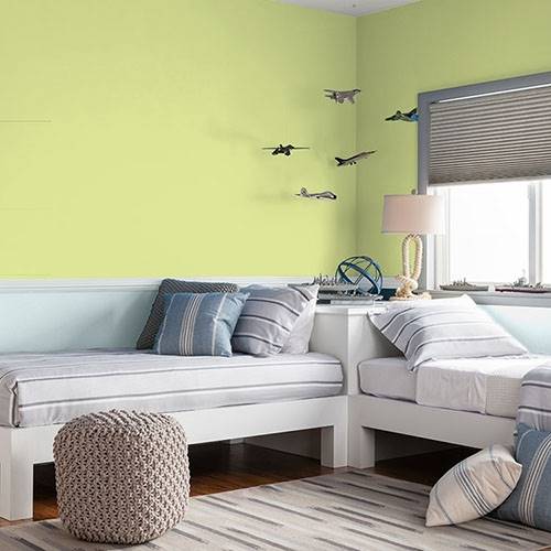 This electric frosty green is perfect for an exercise room or dance inspired area. Trim in white and coordinate lighter shades of blues.