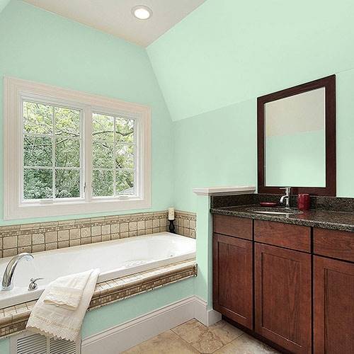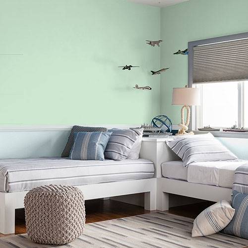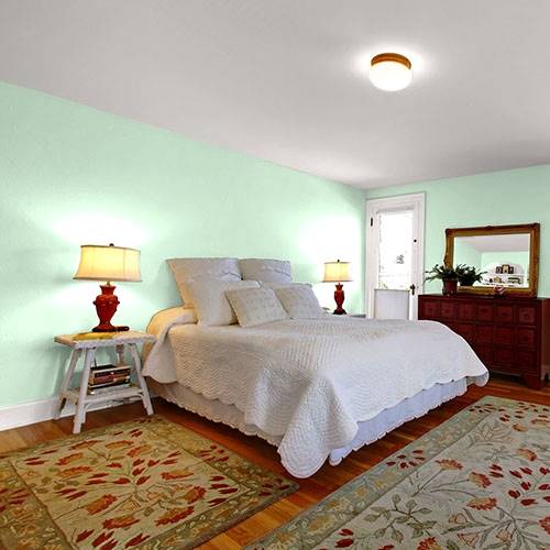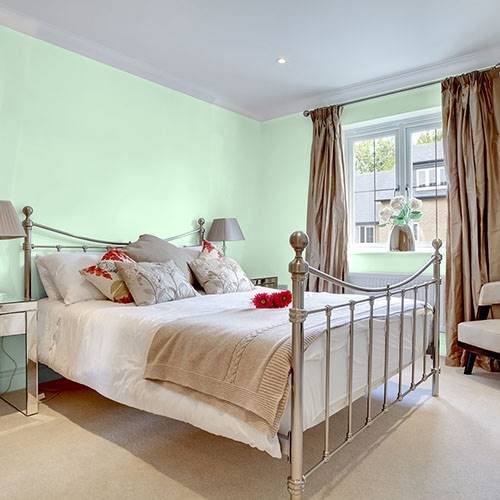 Use this dewy green on all main walls. Apply darker shades of green paired with violet accents to enliven the space of your choice.