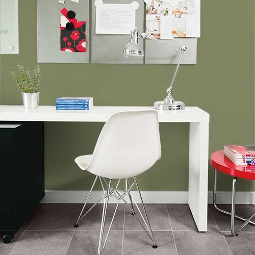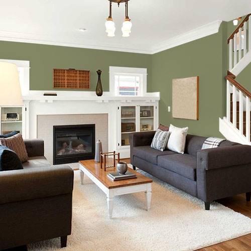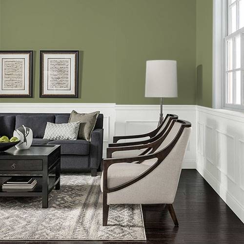 This is a strong midtoned olive, perfect for an accent wall. Apply off-white trim and use natural woods for a reclaimed table as accent pieces.