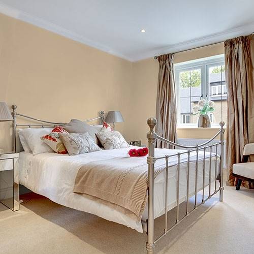 This traditional neutral can be a comforting bedroom. Jewel tones are favored accents with this stylish tan.