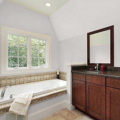 This soft gray is perfect for a transitional kitchen space. Coordinates beautifully with light marble countertops and white trim.