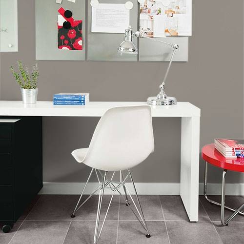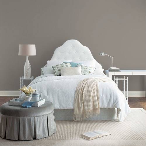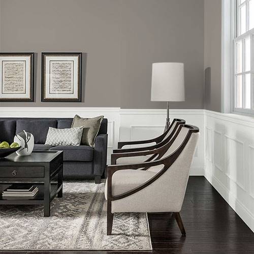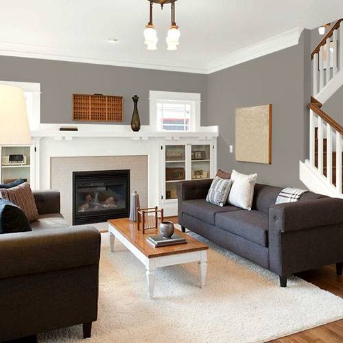 This comforting gray brown tone creates a sophisticated living room. Light aqua blue tones pair harmoniously in this space.