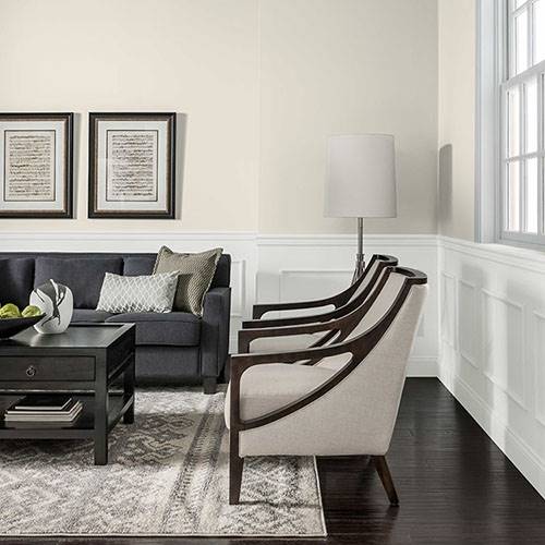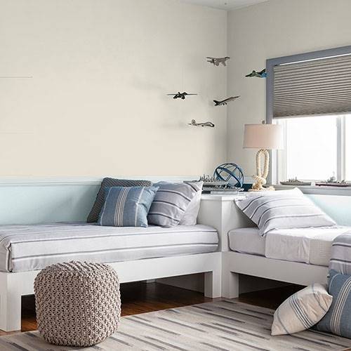 A delicate hazy neutral is a relaxing bedroom color. It can be applied on all four walls and trim in white.