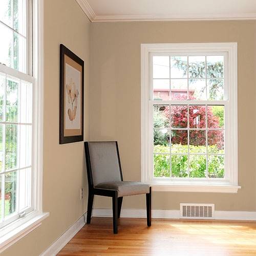 A graceful warm gold is pleasant for a living room. Dark wood selections as well as earth toned reds and greens harmonize this space.
