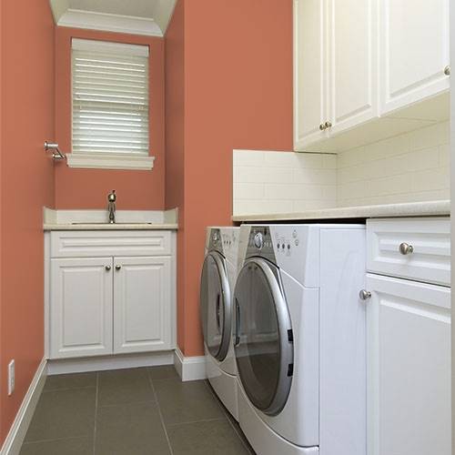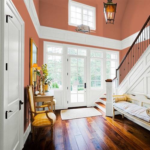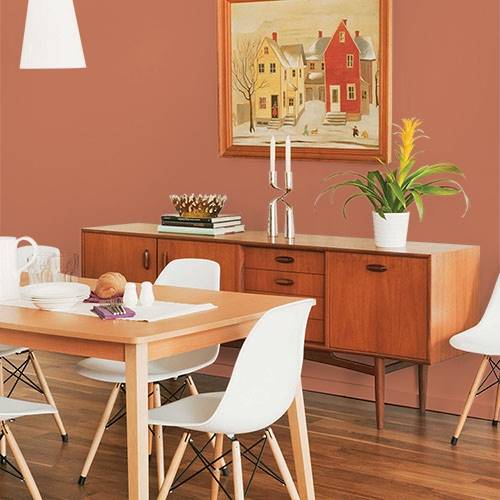 This orange influenced amber creates a glowing accent wall. Add deep mysterious blues for a contrasting tone.