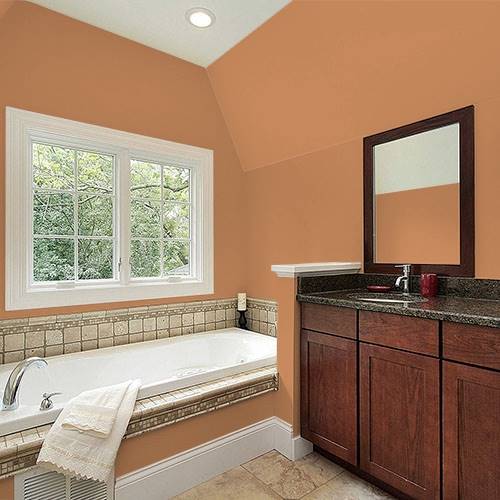 For a Tuscan inspired bathroom, this copper toned hue is an exquisite choice. A cream trim and chocolate brown accents in décor warms this area.