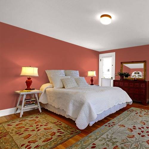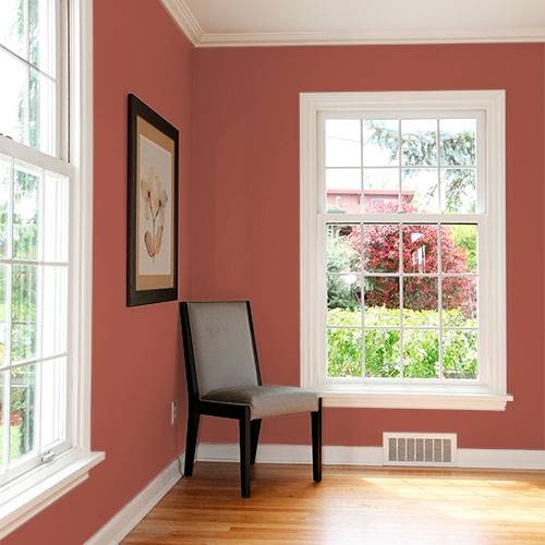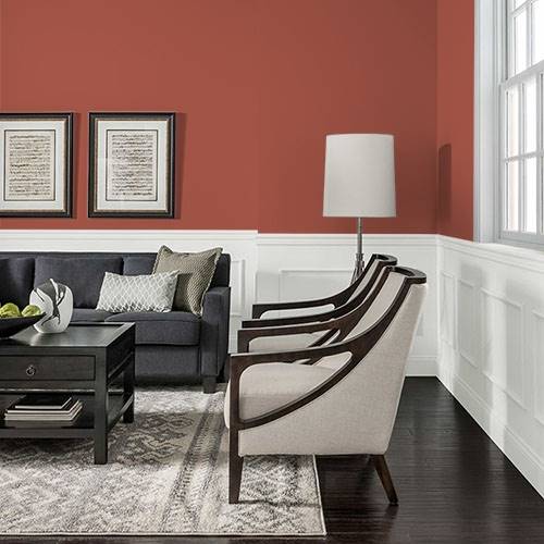 This saturated rust can be backdrop for a stone fireplace wall. Tans and caramel tones are beautiful surrounding walls to this color.