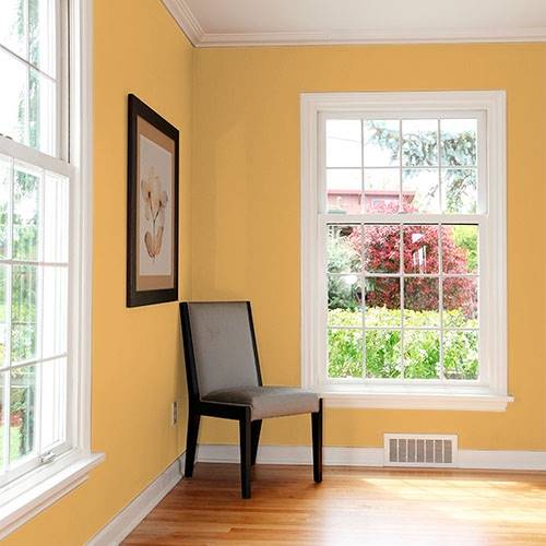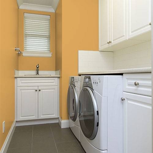 This sparkling golden yellow creates a glowing kitchen area. Paired with white trim and hints of purple add a complementary scheme.