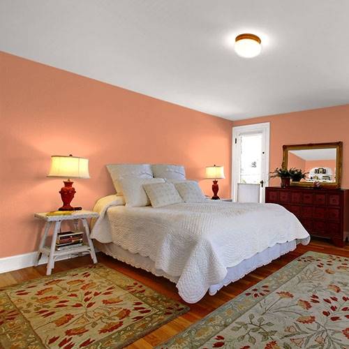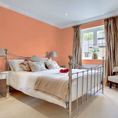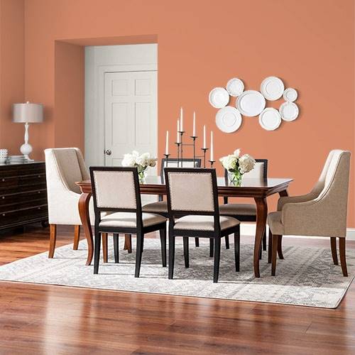 For a zesty coral, this will invigorate a social kitchen atmosphere. Use beautiful white cabinetry and brush gold hardware for subtle elegance.