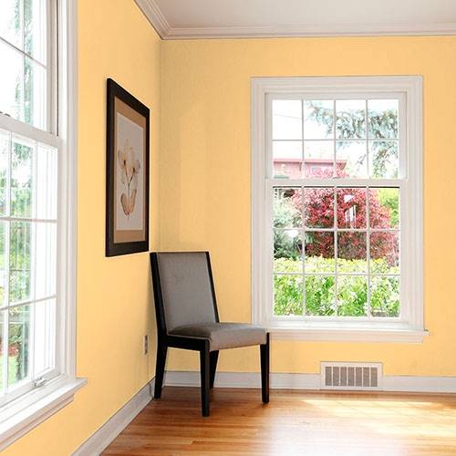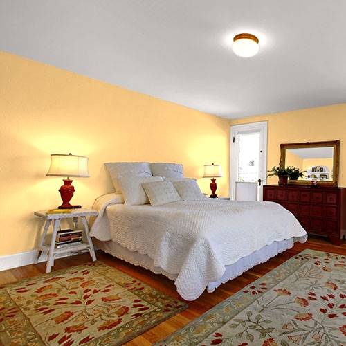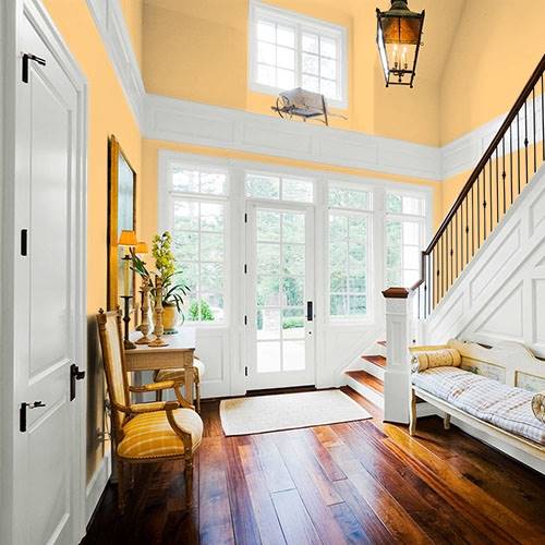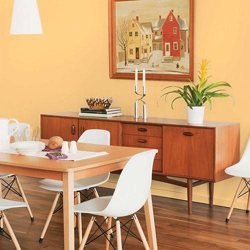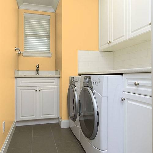 A zesty peach is perfect for the kitchen area. Accents of greens envelops a sense of bringing in the outdoors to the indoors for balancing comfort.