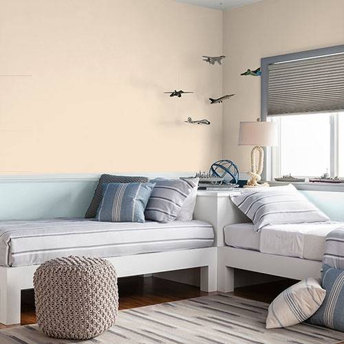 An alluring peachy cream is a great color for any interior wall. For a coastal theme, add touches of midtoned blues.