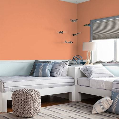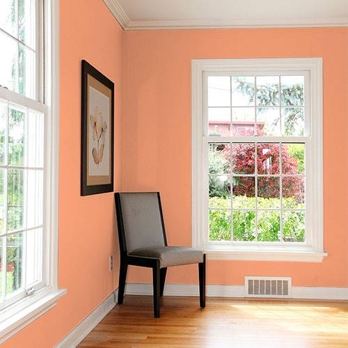This beautiful coral is a beautiful backdrop for a river stone fireplace. Use a lighter beige for a surrounding wall.