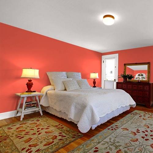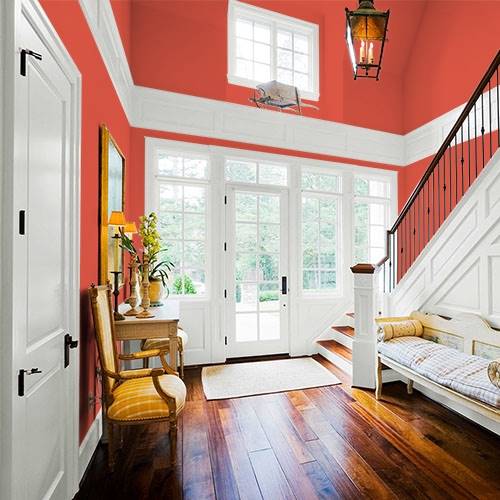 Full of energy, this saturated red is perfect for an accent in an exercise space. Off white is choice selection for the trim color.