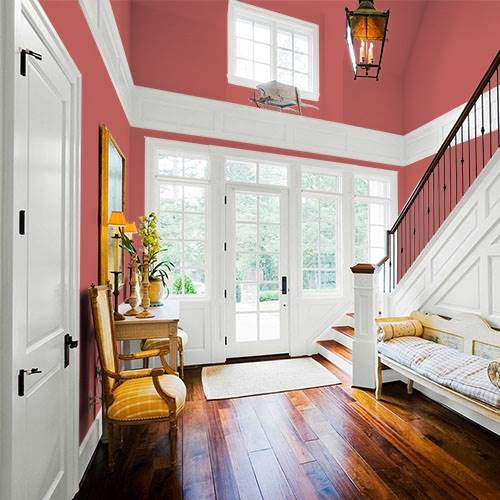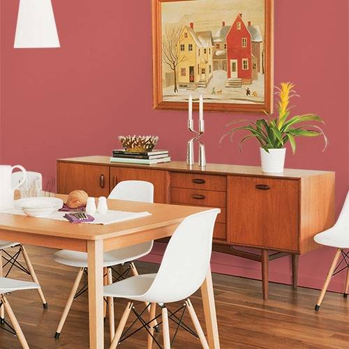 A warm authentic red is an elegant selection for a cozy living room. Creams and chocolate browns harmonize together in this entertaining space