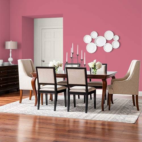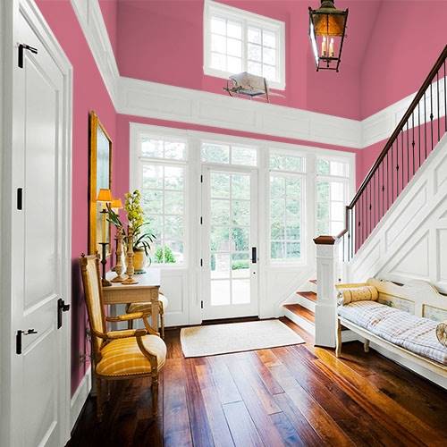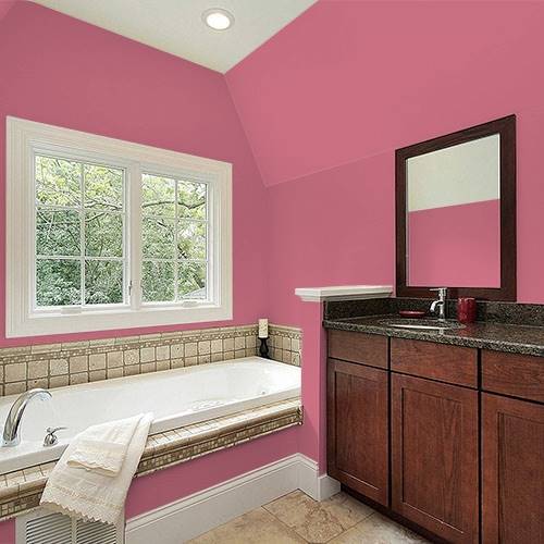 This midtoned red may be used as an accent in a bathroom. Select clear glass materials and silver metals and light gray surrounding walls.