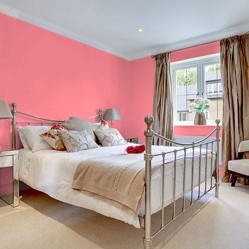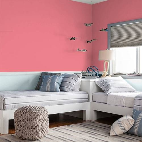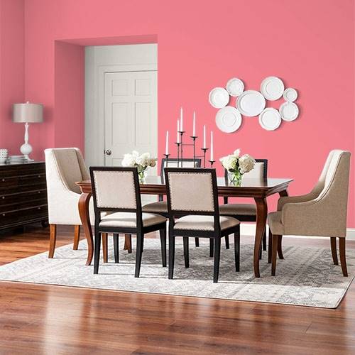 This coral inspired pink is a dazzling hue for a lively dining room Use as an accent wall and pair with lighter creams for the surrounding walls.