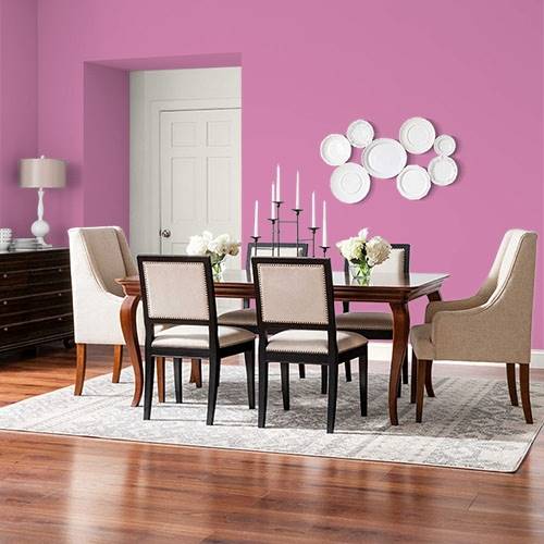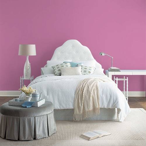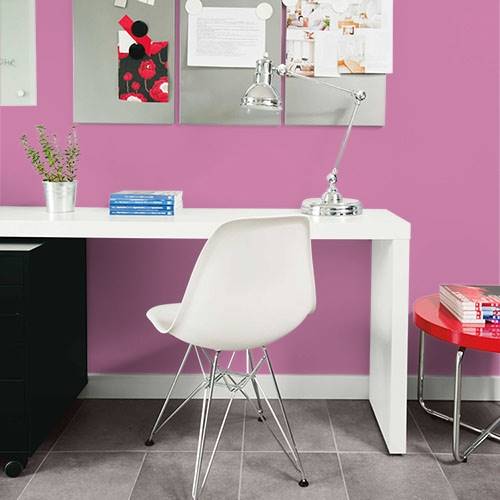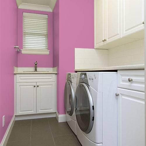 A scrumptious saturated pink adds fashionista style into a powder room. White trim frames this passionate pink perfectly.