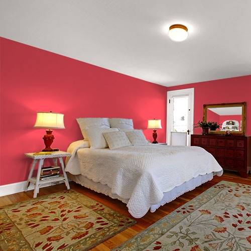 A brilliant red used in a living room. Complimenting a fireplace mantle this hue coordinates with neutral tones.